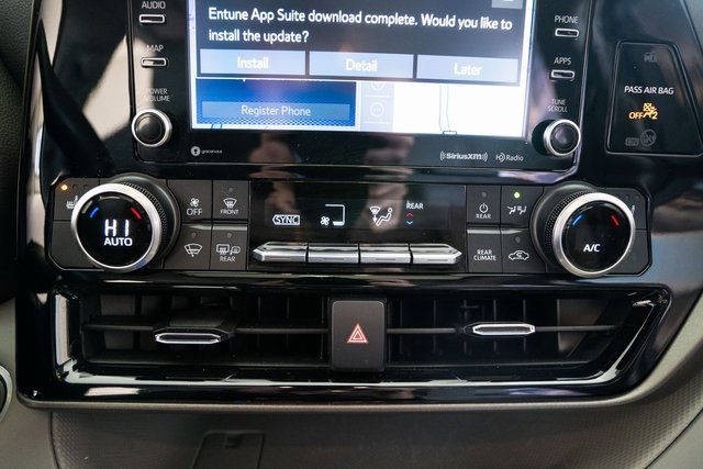 Highlander XLE, 4D Sport Utility, 3.5L V6 DOHC, AWD, Black, 18" Machined Alloy Wheels, 3.003 Axle Ratio, 3rd row seats: split-bench, 4-Wheel Disc Brakes, 6 Speakers, ABS brakes, Air Conditioning, Alloy wheels, AM/FM radio: SiriusXM, Apple CarPlay/Android Auto, Auto High-beam Headlights, Auto-dimming Rear-View mirror, Automatic temperature control, Brake assist, Bumpers: body-color, Delay-off headlights, Driver door bin, Driver vanity mirror, Dual front impact airbags, Dual front side impact airbags, Electronic Stability Control, Emergency communication system: Safety Connect with 1-year trial, Exterior Parking Camera Rear, Four wheel independent suspension, Front anti-roll bar, Front Bucket Seats, Front Center Armrest, Front dual zone A/C, Front fog lights, Front reading lights, Fully automatic headlights, Garage door transmitter: HomeLink, Heated door mirrors, Heated Front Bucket Seats, Heated front seats, Illuminated entry, Knee airbag, Leather Shift Knob, Low tire pressure warning, Occupant sensing airbag, Outside temperature display, Overhead airbag, Overhead console, Panic alarm, Passenger door bin, Passenger vanity mirror, Power door mirrors, Power driver seat, Power Liftgate, Power moonroof, Power passenger seat, Power steering, Power windows, Radio: Audio Plus, Rear air conditioning, Rear anti-roll bar, Rear reading lights, Rear window defroster, Rear window wiper, Reclining 3rd row seat, Remote keyless entry, Roof rack: rails only, Security system, SofTex Seat Trim, Speed control, Speed-sensing steering, Split folding rear seat, Spoiler, Steering wheel mounted audio controls, Tachometer, Telescoping steering wheel, Tilt steering wheel, Traction control, Trip computer, Turn signal indicator mirrors, and Variably intermittent wipers.