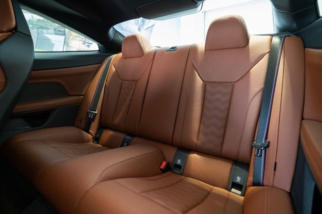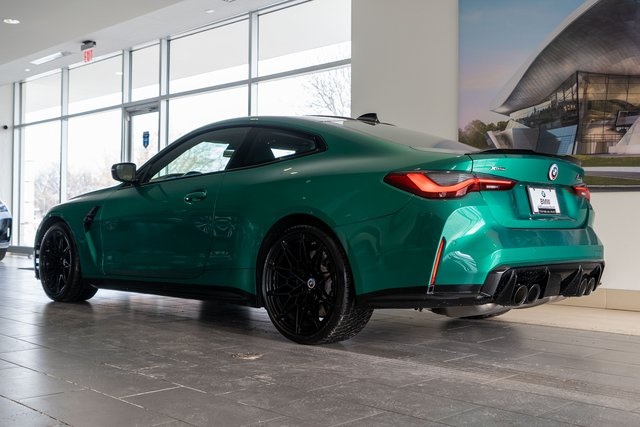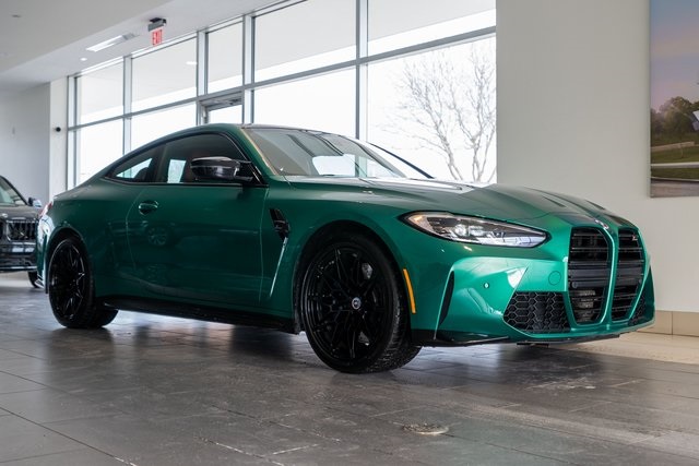 M4 Competition, 2D Coupe, 3.0L I6 Turbocharged DOHC 24V LEV3-ULEV70 503hp, AWD, Isle of Man Green Metallic, Tartufo Leather, 16 Speakers, 4-Wheel Disc Brakes, ABS brakes, Adaptive suspension, Air Conditioning, Alloy wheels, AM/FM radio: SiriusXM, Apple CarPlay & Android Auto Compatibility, Auto High-beam Headlights, Auto-dimming door mirrors, Auto-dimming Rear-View mirror, Automatic temperature control, BMW Assist eCall, BMW TeleServices, Brake assist, Bumpers: body-color, Compass, ConnectedDrive Services, Delay-off headlights, Driver door bin, Driver vanity mirror, Dual front impact airbags, Dual front side impact airbags, Electronic Stability Control, Emergency communication system: BMW Assist eCall, Enhanced USB/Bluetooth Plus Smartphone Integration, Extended Merino Leather Upholstery, Exterior Parking Camera Rear, Four wheel independent suspension, Front anti-roll bar, Front Bucket Seats, Front Center Armrest, Front dual zone A/C, Front reading lights, Fully automatic headlights, Garage door transmitter, harman/kardon Surround Sound System, harman/kardon® Speakers, Heated door mirrors, Heated front seats, Illuminated entry, Individual Piano Black Finish Trim, Knee airbag, Leather Shift Knob, Live Cockpit Pro w/Navi, Low tire pressure warning, Lumbar Support, M Sport Seats, Memory seat, Navigation System, Occupant sensing airbag, Outside temperature display, Overhead airbag, Overhead console, Panic alarm, Passenger door bin, Passenger vanity mirror, Power door mirrors, Power driver seat, Power Front Seats, Power passenger seat, Power steering, Power windows, Radio data system, Radio: AM/FM Audio System, Rain sensing wipers, Rear air conditioning, Rear anti-roll bar, Rear reading lights, Rear seat center armrest, Rear window defroster, Remote keyless entry, Security system, SiriusXM Satellite Radio, Speed control, Speed-sensing steering, Speed-Sensitive Wipers, Split folding rear seat, Spoiler, Sport steering wheel, Steering wheel mounted audio controls, Tachometer, Telescoping steering wheel, Tilt steering wheel, Traction control, Trip computer, Turn signal indicator mirrors, Variably intermittent wipers, and Wheels: 19" x 9.5" Fr/20" x 10.5" Rr (Style 826M)
