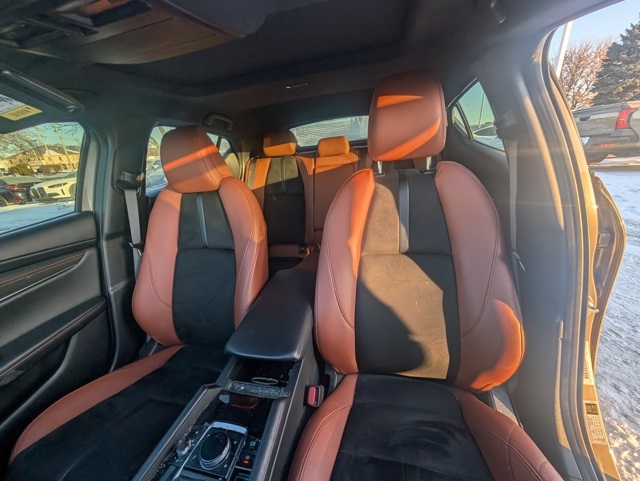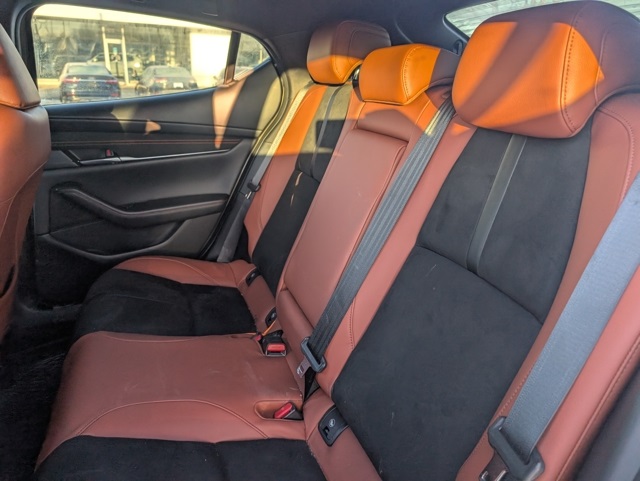 Mazda3 2.5 Carbon Turbo, 4D Hatchback, 2.5L I4, AWD, Zircon Sand Metallic, Teracotta Artificial Leather, 4-Wheel Disc Brakes, 8 Speakers, ABS brakes, Air Conditioning, Alloy wheels, AM/FM radio, Auto High-beam Headlights, Automatic temperature control, Brake assist, Bumpers: body-color, Compass, Delay-off headlights, Driver door bin, Driver vanity mirror, Dual front impact airbags, Dual front side impact airbags, Electronic Stability Control, Emergency communication system: Mazda Connected Services (3-year complimentary trial included), Exterior Parking Camera Rear, Front anti-roll bar, Front Bucket Seats, Front Center Armrest, Front dual zone A/C, Front reading lights, Front wheel independent suspension, Fully automatic headlights, Heated door mirrors, Heated Front Bucket Seats, Heated front seats, High Wall All-Weather Floor Mats, Illuminated entry, Knee airbag, Leather Shift Knob, Leather steering wheel, Leatherette Seat Trim, Low tire pressure warning, MAZDA CONNECT Infotainment System, Memory seat, Occupant sensing airbag, Outside temperature display, Overhead airbag, Overhead console, Panic alarm, Passenger door bin, Passenger vanity mirror, Power door mirrors, Power driver seat, Power moonroof, Power steering, Power windows, Radio data system, Radio: AM/FM/HD Audio System, Rain sensing wipers, Rear seat center armrest, Rear side impact airbag, Rear window defroster, Rear window wiper, Remote keyless entry, Speed control, Speed-sensing steering, Split folding rear seat, Spoiler, Steering wheel mounted audio controls, Tachometer, Telescoping steering wheel, Tilt steering wheel, Traction control, Trip computer, Turn signal indicator mirrors, Variably intermittent wipers, and Wheels: 18" x 7J Aluminum Alloy.